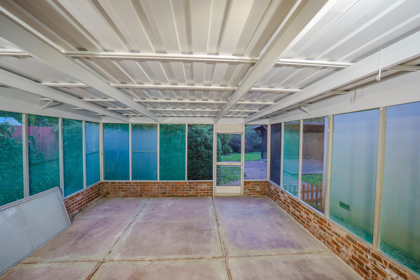 The yard also includes useful storage units for extra convenience.